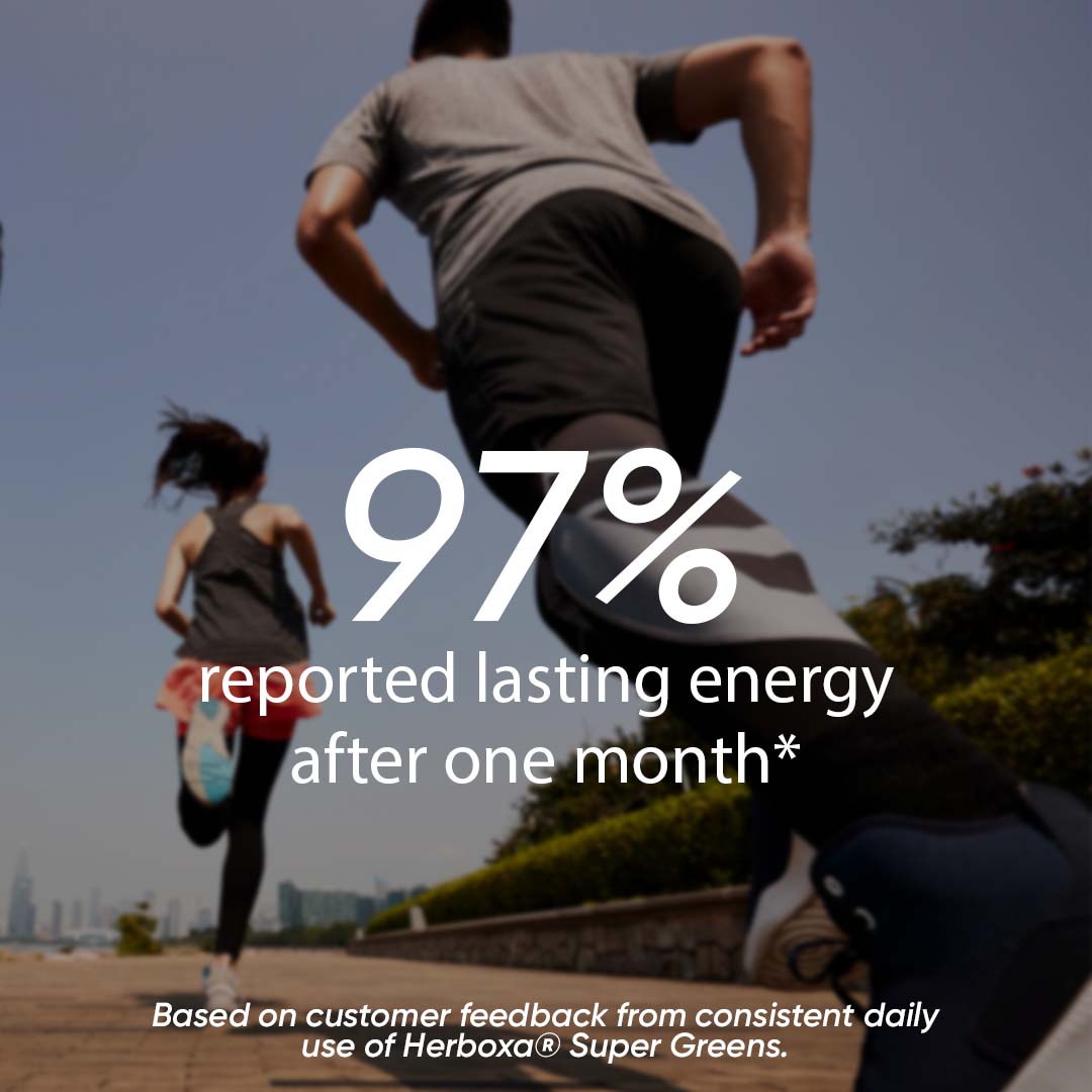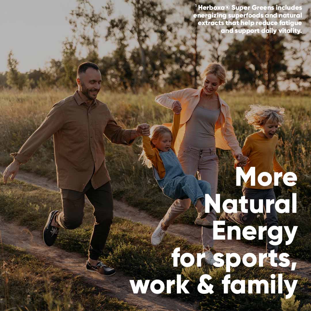 ¹ Herboxa® SUPER GREENS includes energizing plant-based nutrients that support normal energy[¹] natural energy processes and help reduce tiredness and fatigue.