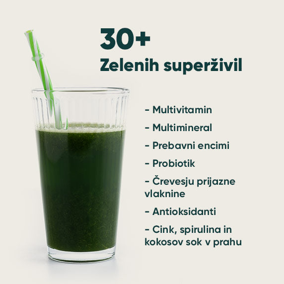 Vsebuje več kot 30 superživil, probiotikov, prebavnih encimov, vitaminov in mineralov, ki pomagajo pri lajšanju napihnjenosti, dvigu energije, uravnavajo željo po hrani in poskrbijo za odpornost ter lepe lase in nohte.