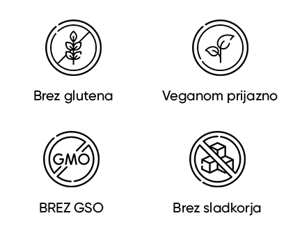Brez dodanega sladkorja, polnil, barvil, GSO, mlečnih izdelkov, težkih kovin ali drugih škodljivih snovi.